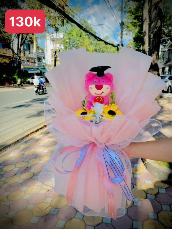 Gửi gắm yêu thương và lời chúc tốt đẹp nhất với bó hoa độc đáo này! Với chú gấu hồng đội mũ cử nhân đáng yêu, cùng những bông hướng dương vàng tươi tràn đầy năng lượng và một đóa hồng trắng tinh khôi, bó hoa là sự kết hợp hoàn hảo giữa vẻ đẹp và ý nghĩa. Món quà lý tưởng để chúc mừng tốt nghiệp, sinh nhật hoặc bất kỳ dịp đặc biệt nào bạn muốn lan tỏa niềm vui.